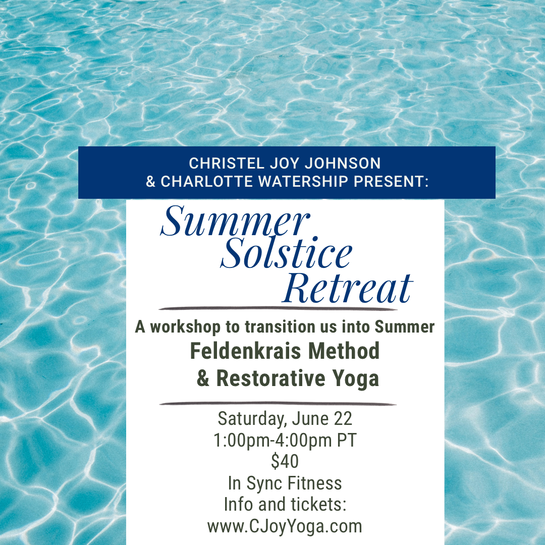 Come and FEEL into Summer. This mini-retreat brings together the shared practices of Restorative yoga, Feldenkrais Method, meditation, breathwork, sounding, and community coming together to create a powerful space for healing & transformation. Charlotte and I are very excited to host this summer solstice gathering. For more info and to purchase your spot go to: https://www.cjoyyoga.com/purchasing/winter-solstice-retreat